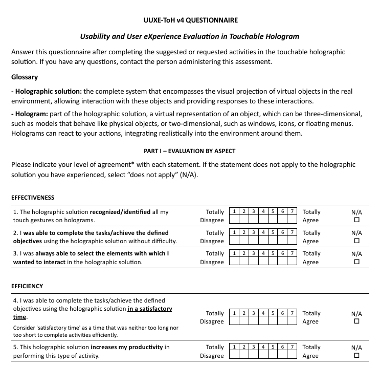 UUXE-ToH (Usability and User eXperience Evaluation in Touchable Hologram) is a evaluation technology to assess user experience in touchable holographic interfaces, like solutions in Mixed or Augmented Reality.